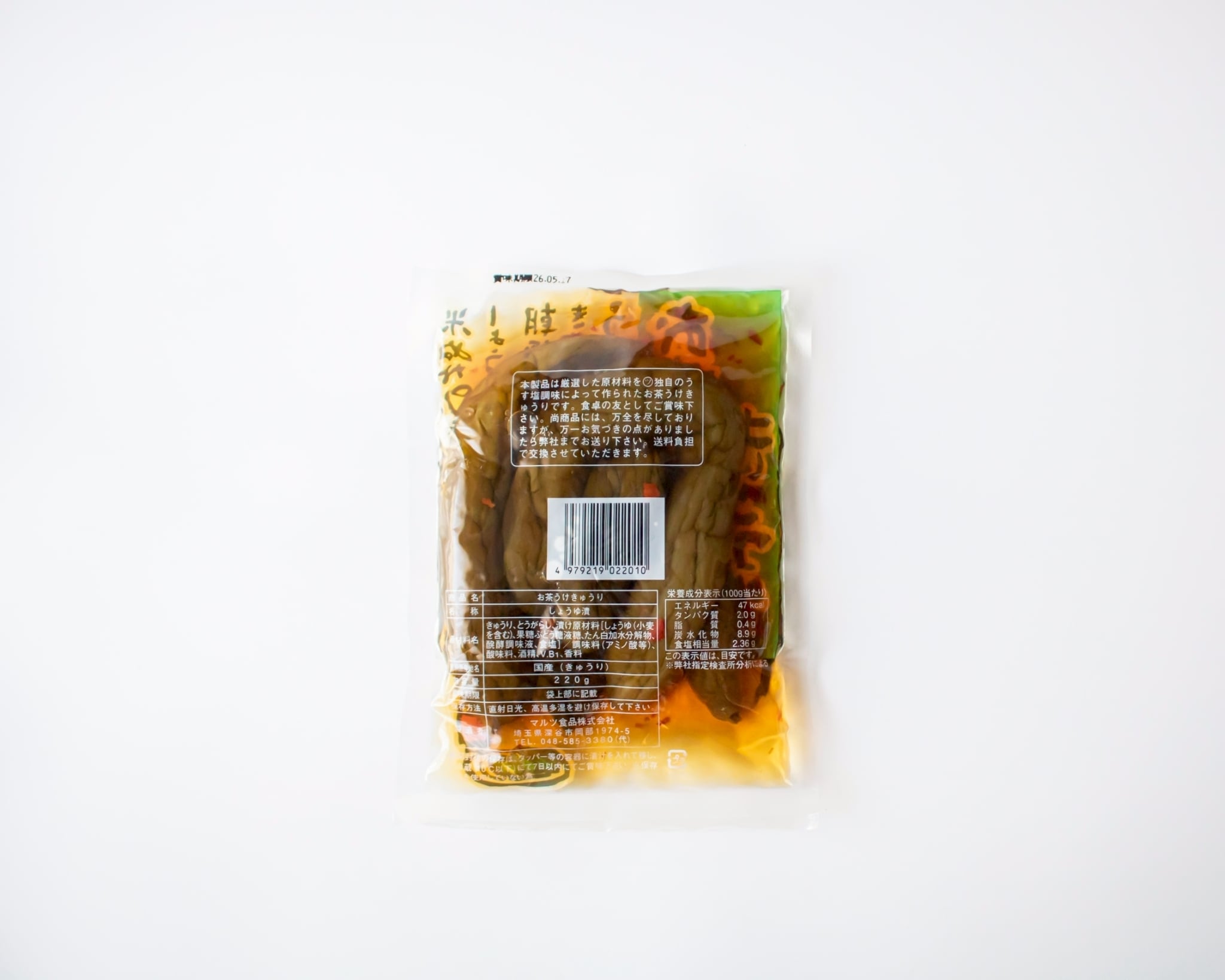 埼玉県北部産の朝採りしたきゅうりを新鮮なうちに漬け込み、充分に発酵熟成させ、しょう油と米ぬか発酵調味液をベースに味付け致しました。
